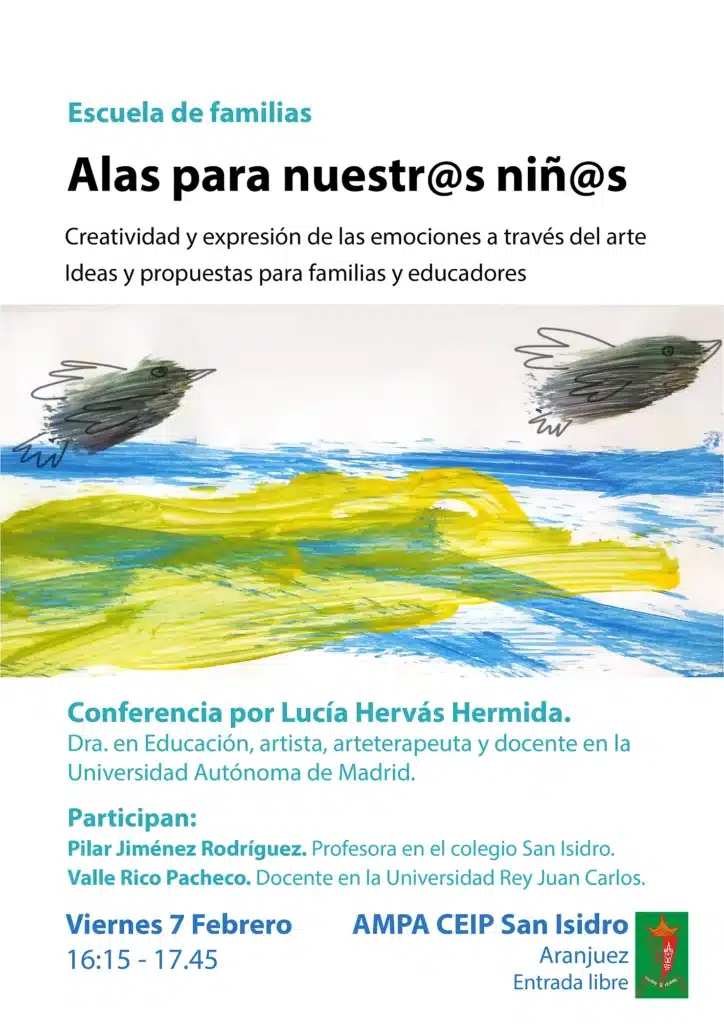 El próximo 7 de febrero tengo el placer de compartir con las familias del CEIP San Isidro mi visión sobre la importancia del arte y la creatividad para la expresión y el desarrollo de los niños y las niñas, y contar en qué consiste mi trabajo en arteterapia.